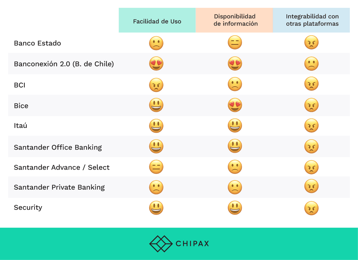 Es por eso que en Chipax hemos analizado cuáles son las cuentas corrientes para empresas más y menos tecnológicas, basándonos en nuestra experiencia cargando datos de los movimientos bancarios desde distintos bancos para nuestros clientes, tratando de sacar datos consistentes y lo más completos posibles para facilitar la conciliación bancaria.